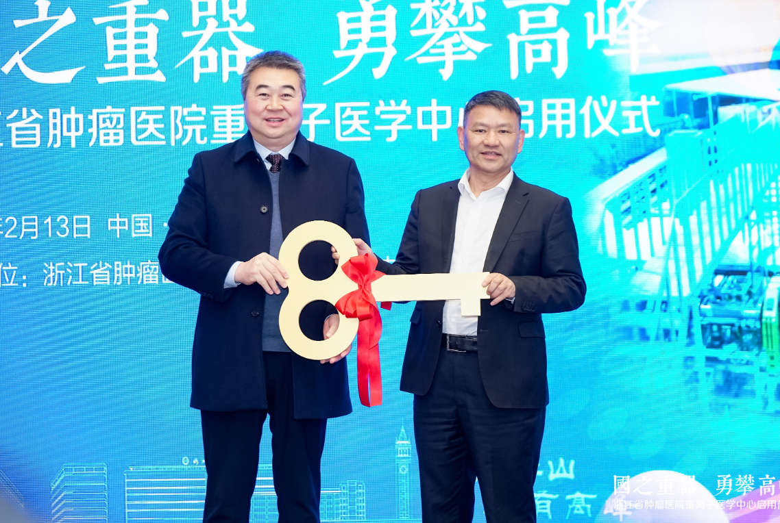 在重原子设备钥匙移交仪式上,国科原子医疗科技有限公司董事长马力祯先生向中国科研院院士、中国科研院杭州医学研究所所长、浙江省肿瘤医院院长谭蔚泓先生移交钥匙。钥匙的成功移交,意味着浙江省重原子医学开启全新的征程。